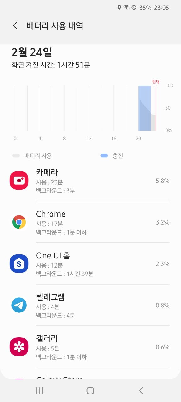 배터리에 관한 부분은 1시간 51분 동안 17.1%가 소모되었다. (Wifi, 유심 없음, 120Hz, 화면 밝기 60% 수준, 최적화 모드)