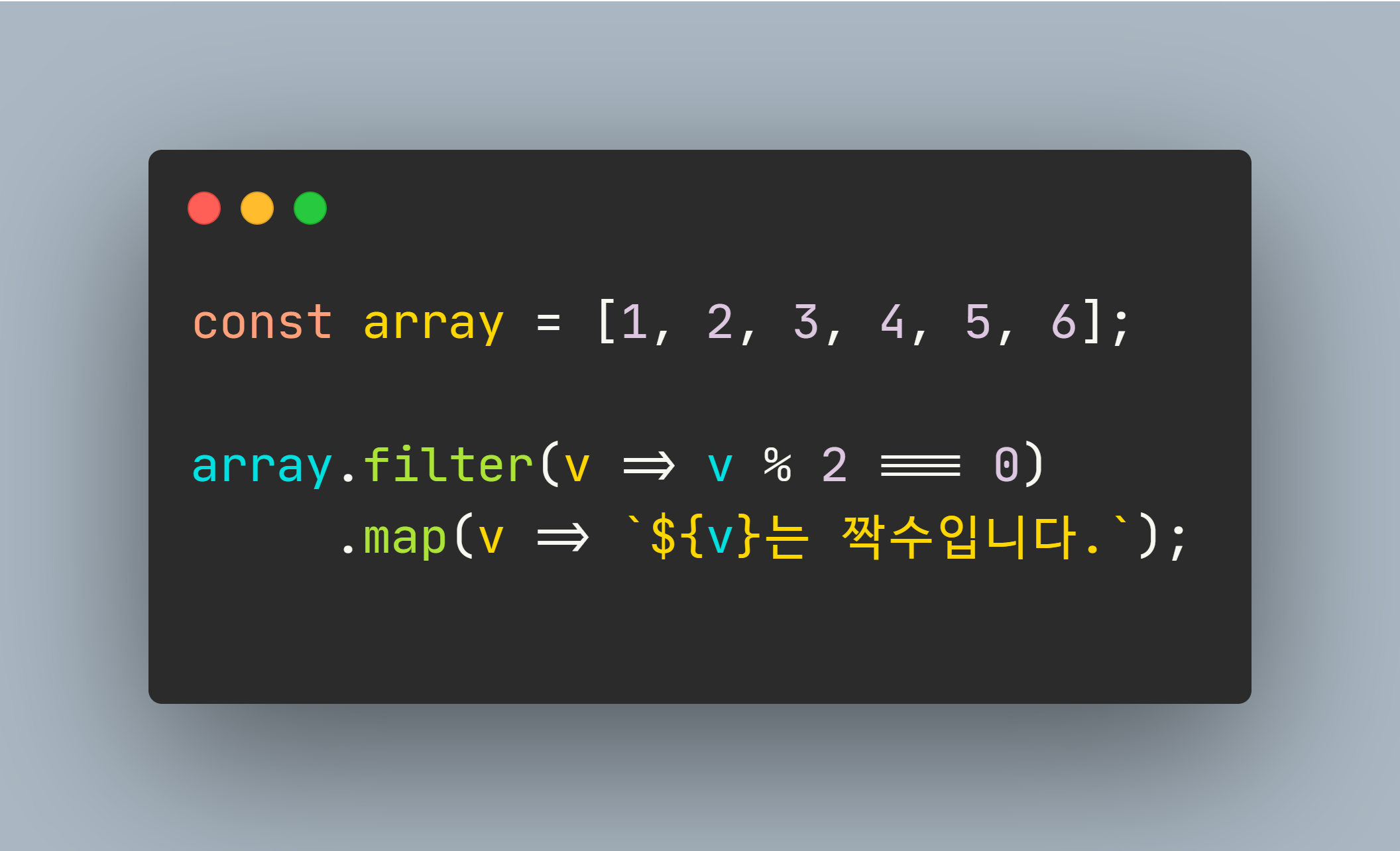 단, 같은 배열을 2번 순회하기 때문에, 성능이 중요한 경우(filter 후 map이 for문 보다 20%이상 느리다.)에는 for문을 사용해서 배열을 1번만 순회하도록 변경할 필요가 있다.