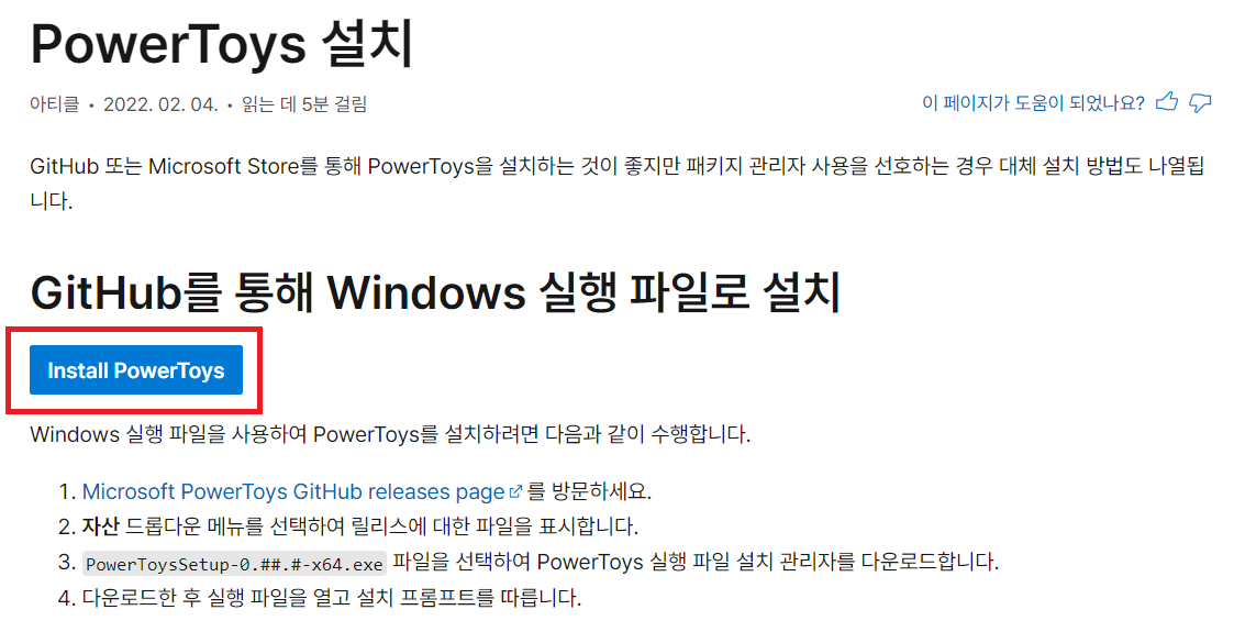 먼저 설치 안내 페이지에 접속하여 PowerToys 프로그램을 설치합니다.