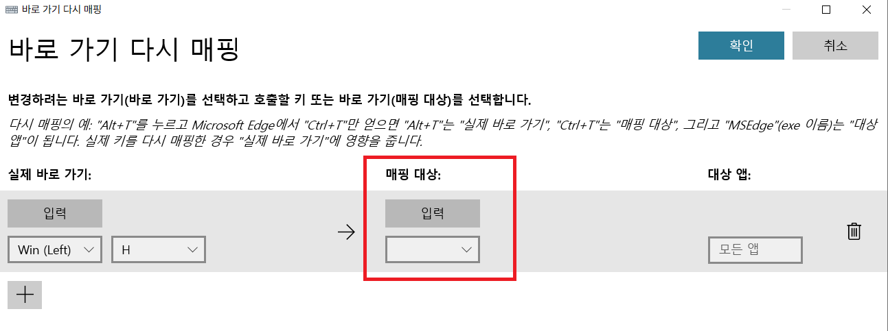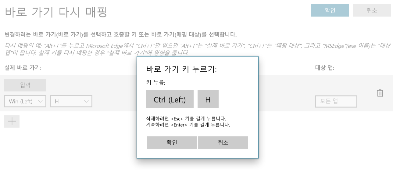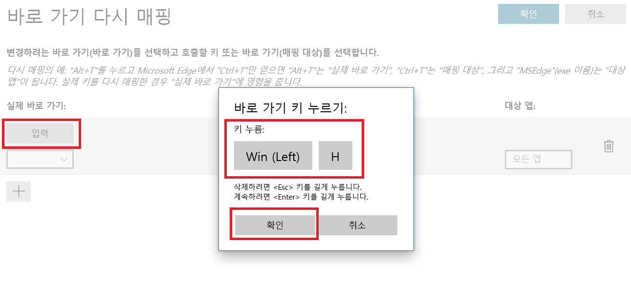 입력을 누르면 '바로가기 키 누르기' 창이 뜹니다. 이 때 Win키와 H 키를 동시에 눌러줍니다. '키 누름:' 밑에 사진과 같이 Win (Left) H로 뜨면 성공입니다. 아무 키도 누르지 말고 '확인' 버튼을 누릅니다.