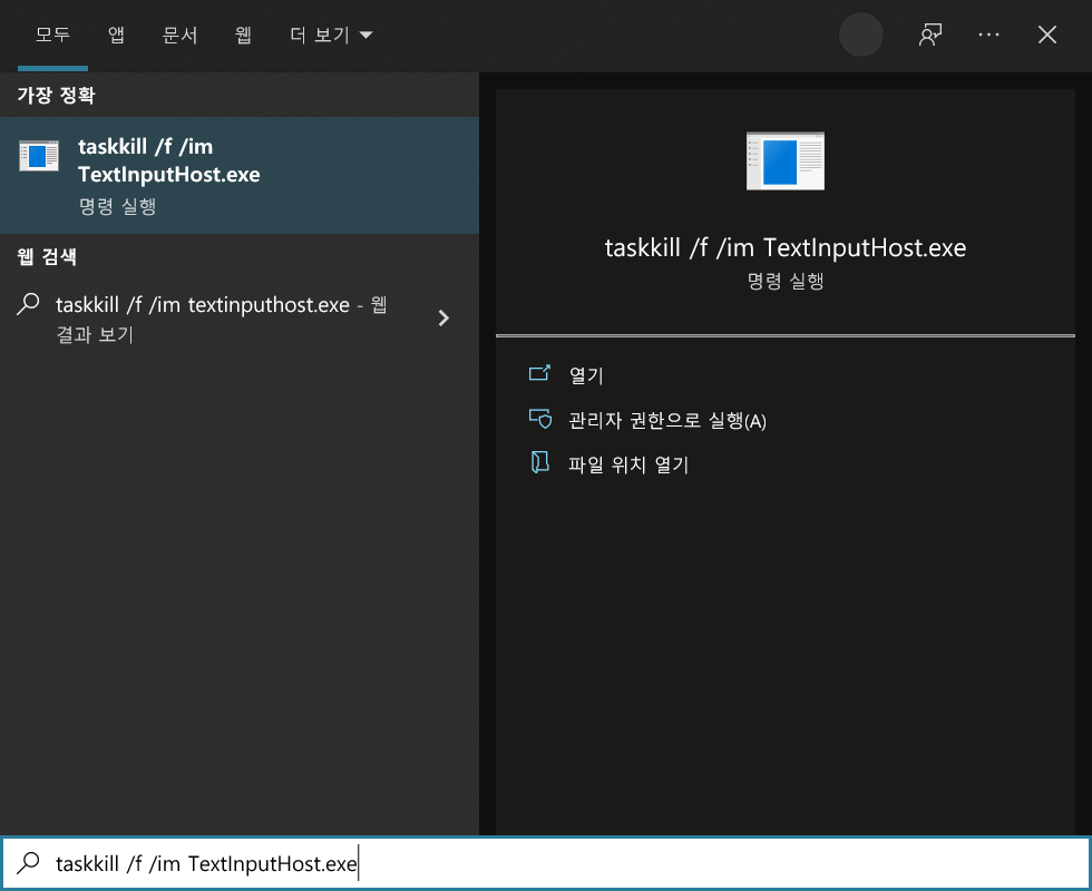 2. 윈도우 버튼이나 검색 버튼을 눌러 검색창에 아래와 같이 'taskkill /f /im TextInputHost.exe' 을 붙여넣고 엔터