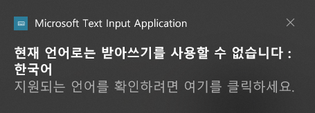 'ㅈㅏㅇㅡㅁㅂㅜㄴㄹㅣ'와 같이 윈도우를 사용하다보면 아래와 같은 '현재 언어로는 받아쓰기를 사용할 수 없습니다' 라는 메시지와 함께