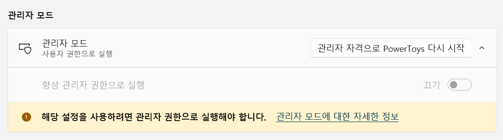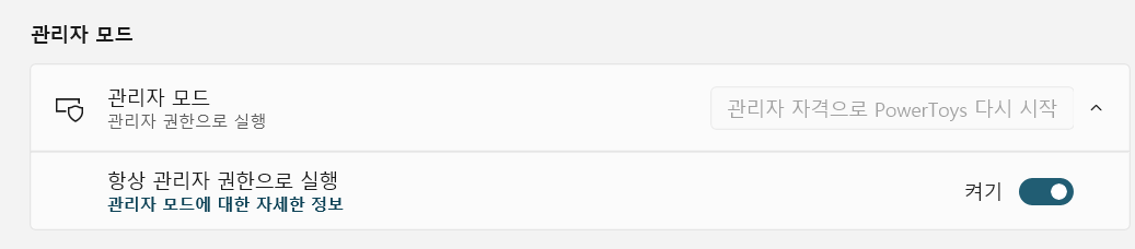 관리자 자격으로 PowerToys 다시 시작 버튼을 누릅니다.