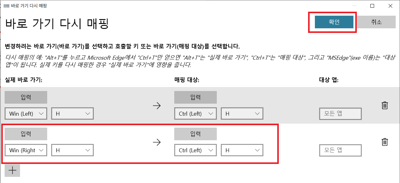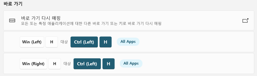위와 같이 Win+H 단축키가 원하는 단축키로 변경되었으면 성공입니다!