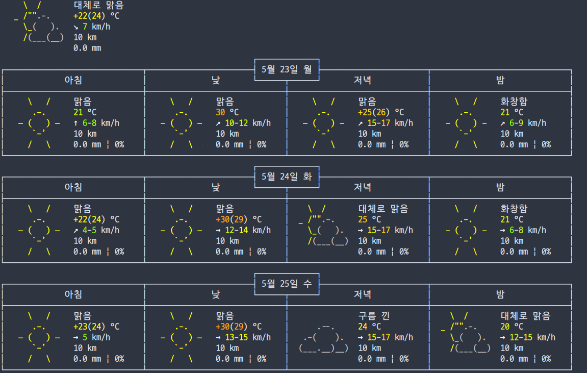 먼저, wttr.in은 wego의 래핑으로 시작한 프로젝트로 콘솔 지향 기상 예보 서비스다. 이미지 없이 Text만으로도 멋진 날씨 정보를 볼 수 있는 서비스다. 자세한 정보는 https://github.com/chubin/wttr.in를 참조하면 된다.